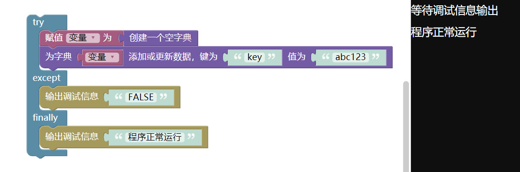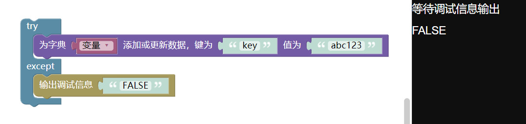 首先运行”try“对应的积木块,如果程序运行出错,运行”exception“对应的积木块,输出”FALSE“