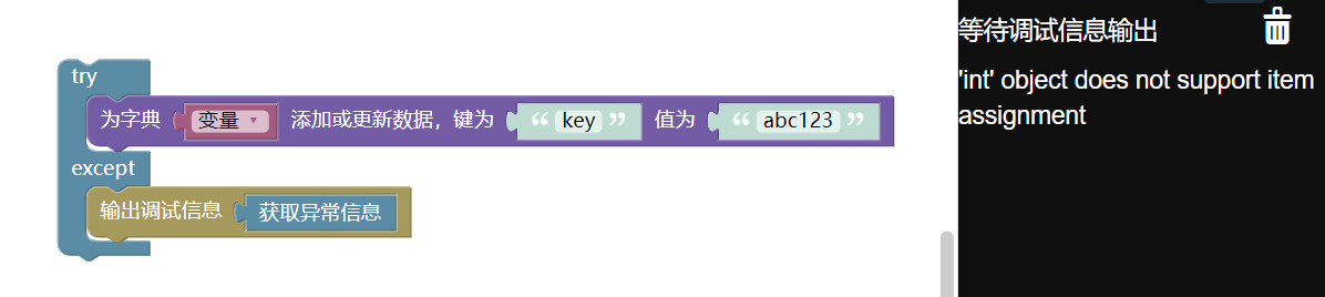 - 功能简介:首先运行”try“对应的积木块,如果程序运行出错,运行”exception“对应的积木块