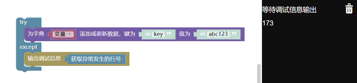 首先运行”try“对应的积木块,如果程序运行出错,运行”exception“对应的积木块,输出”发生程序异常的程序行数“