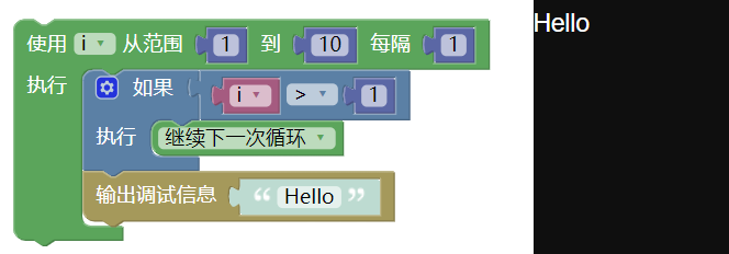 • 功能简介:中断本次循环,跳过循环的剩余部分进行下一次循环。
