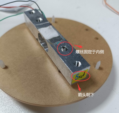 - 取出一枚螺丝,穿过底片和垫片固定在称重仪主体的内侧。注意:螺丝有粗细之分,选择与螺丝口径对应的孔进行固定。在固定称重仪主体时需要注意箭头应向下。(指向底盘方向)