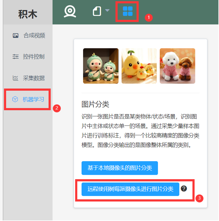 按顺序点击更多功能——机器学习——远程使用树莓派摄像头进行图片分类。