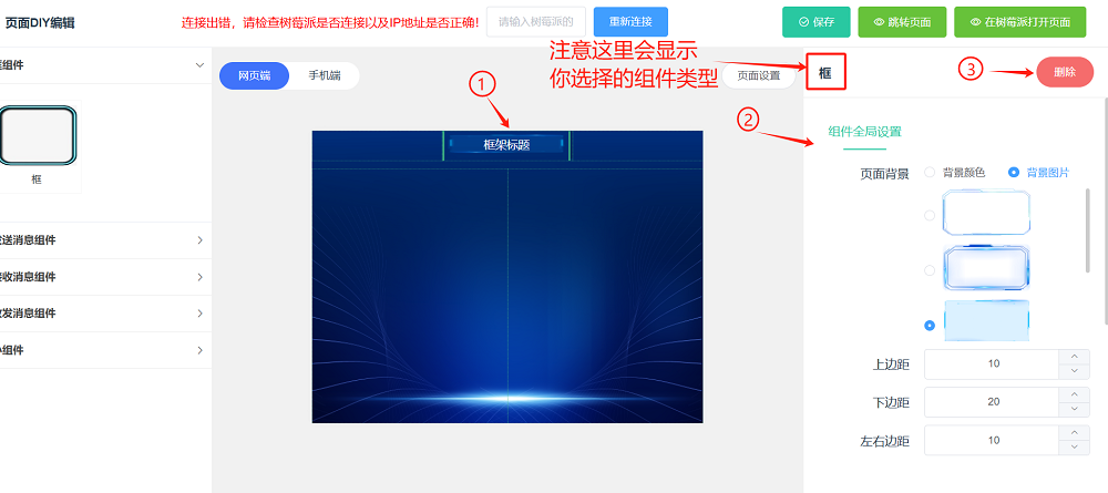 如果第一步的连接设备没有成功,会出现下图的红色字样提示连接错误。这个错误提示不影响自定义页面的编辑和创建,只是在点击页面右上角的在树莓派打开页面按钮将页面在树莓派上打开时会失败。