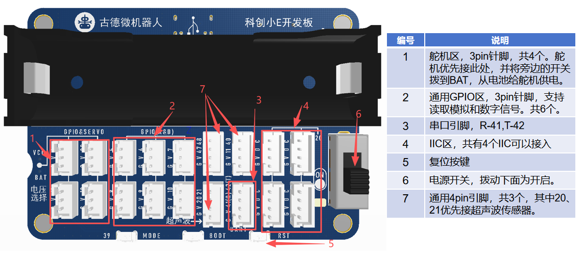 - 使用舵机时,并务必接到小E板的舵机区接口,并将旁边的开关拨动到BAT。