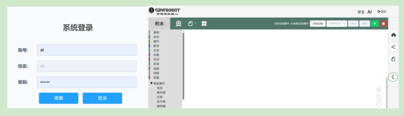 在chrome浏览器(推荐使用)地址栏输入 www.gdwrobot.cn/ai,然后输入测试账号ai,密码123456,即可进入编程平台: