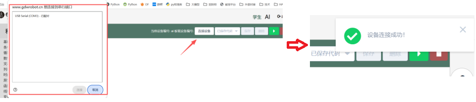 如下图,点击连接设备,弹框选择要连接的串口设备,出现设备连接成功即可