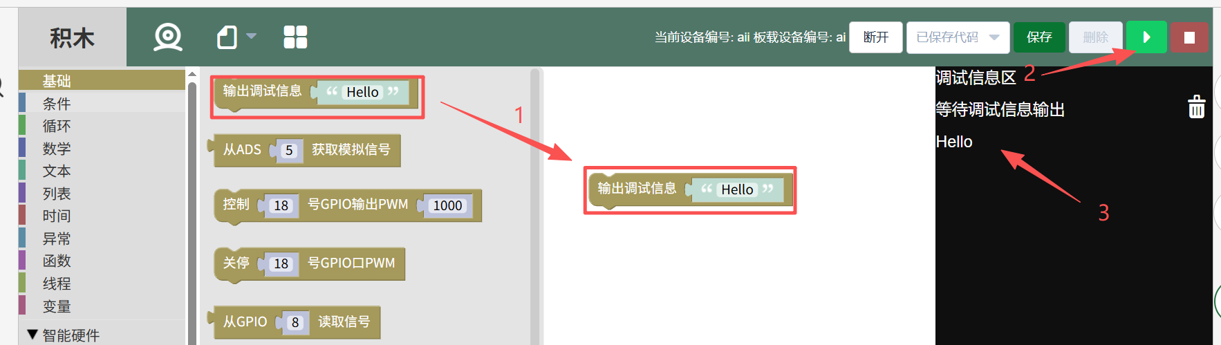然后如下图,拖动一个【输出调试信息】积木到编程区,并点击运行按钮,可以在左侧的调试区看到有输出信息。