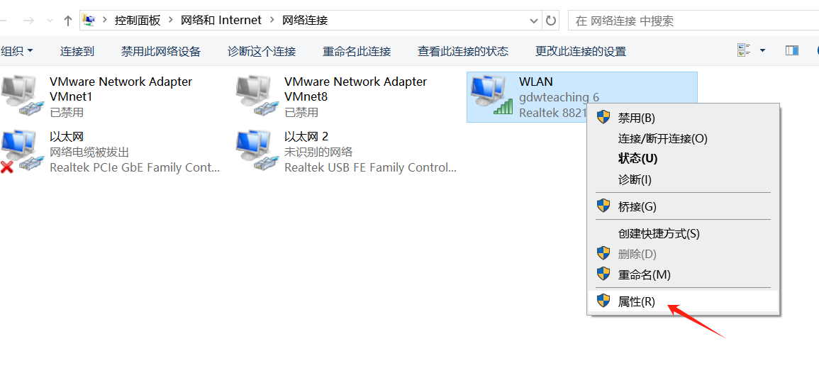 点击上图中【高级网络设置->更改适配器选项】,打开网络连接界面,然后在电脑使用的网络连接(图中我使用的是网络连接是WLAN)上鼠标右键点击,选择属性。